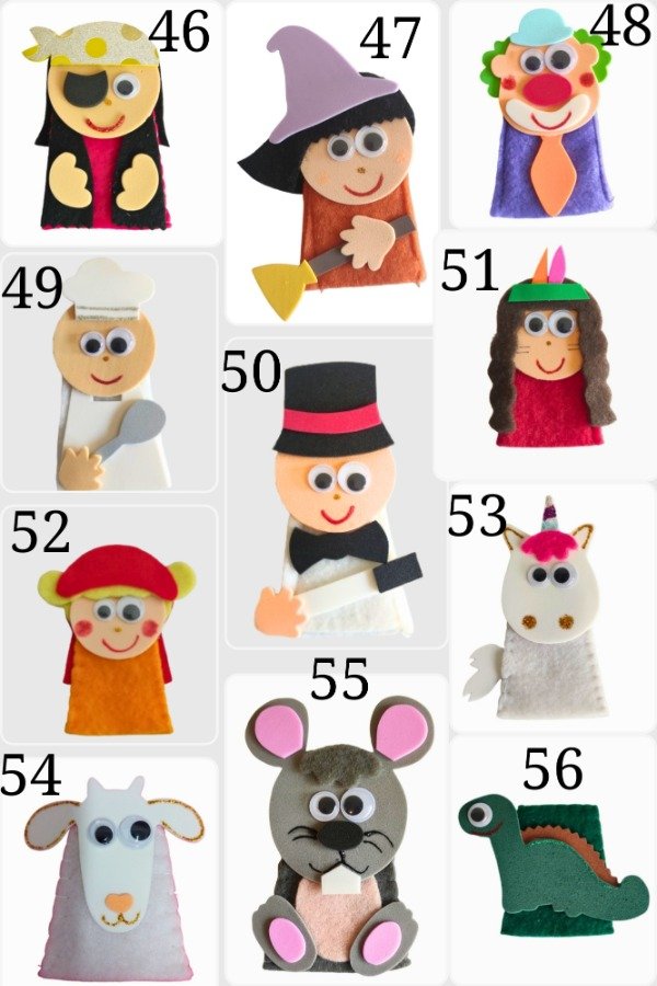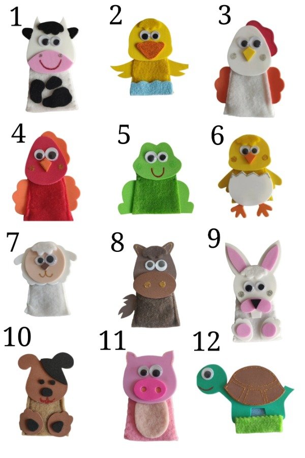 Los títeres son a elección y en la descripción abajo tenés los nombres que corresponden a cada títere (ver fotos).